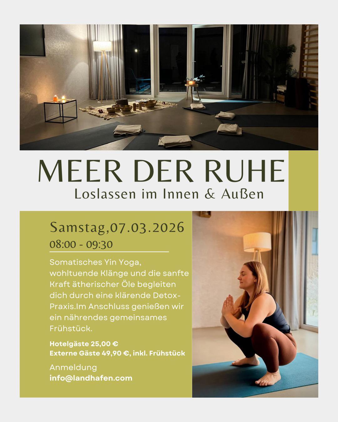 Unsere Yoga-Wochenenden im Hotel Landhafen laden dich ein, bewusst aus dem Alltag auszusteigen und wieder bei dir selbst anzukommen. Es sind kleine Auszeiten, in denen du zur Ruhe kommen, neue Kraft schöpfen und dich auf allen Ebenen nähren darfst - körperlich, geistig und emotional.