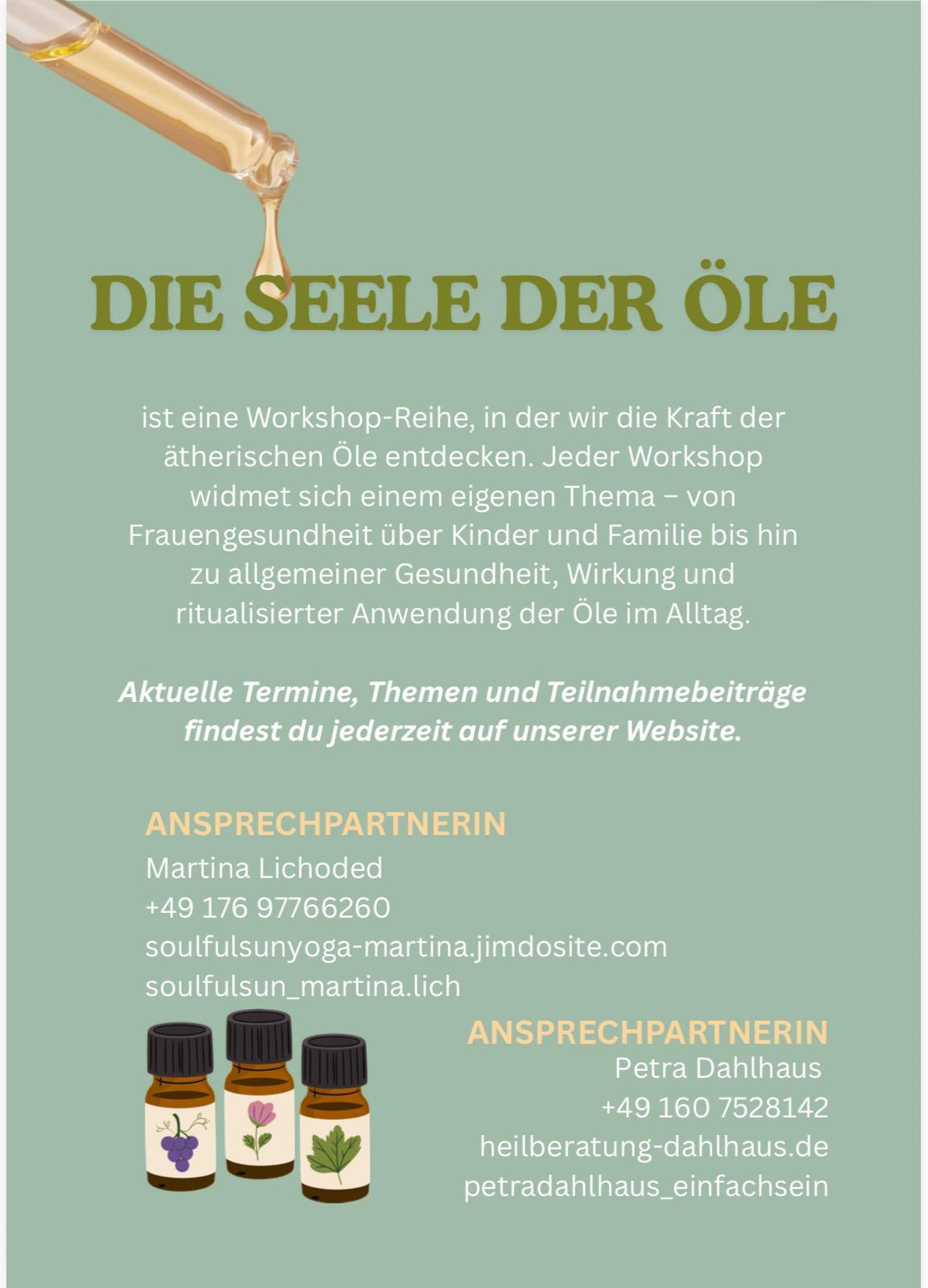 In liebevoller Atmosphäre erfährst du, was ätherische Öle so besonders macht, wie schnell sie ihre Wirkung entfalten und wie du sie sicher und wirkungsvoll im Alltag anwenden für Körper, Geist und Seele einsetzen kannst. Im Anschluss darf sich jeder Teilnehmer seinen eigenen individuellen Rollon erstellen.